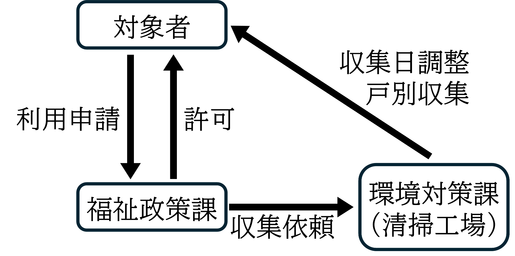 ●対象者は原則、おおむね65歳以上の単身世帯で体が不自由な方・高齢者のみの世帯(夫婦共高齢で体が不自由)・介護保険受給者・身体障害者手帳所持者で、ごみ収集場所までごみの持ち出しが困難な方 ※原則にあてはまる方(介護認定や身体障害者認定を受けている等)でも、自分でごみの持ち出しが可能と思われる心身状況にある方はご利用できません。 |