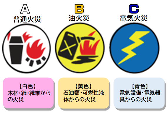 消火器は、火災の種類によって、主に3つの種類に分類されます。